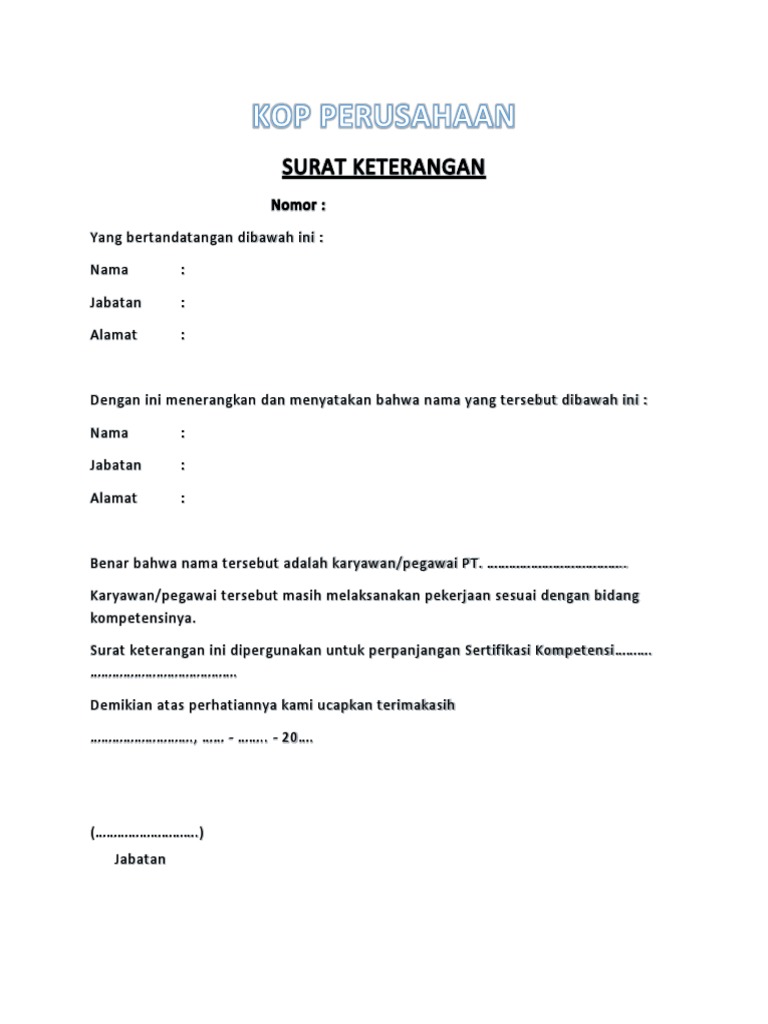 Banyak dari kita yang sudah bekerja atau pun pernah bekerja dan sedang mencari kerja tetapi masih terasa asing dengan surat keterangan kerja. Surat ini sebenarnya dimiliki oleh karyawan atau orang yang memiliki ikatan kerja. Untuk karyawan yang masih bekerja, terdapat sedikit perbedaan isi dan format suratnya dibandingkan surat keterangan kerja untuk karyawan yang keluar. Surat keterangan kerja juga disebut sebagai surat pengalaman kerja (experience letter) atau dalam kuhp perdata pasal 1602z disebut dengan surat pernyataan yang berkenaan dengan berakhirnya hubungan kerja karyawan dengan perusahaan. Yang bertanda tangan di bawah ini :